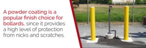A powder coating is a popular finish choice for bollards, since it provides a high level of protection from nicks and scratches, which may be caused by vehicles and pedestrians alike. The powder coating also protects the bollard from damage caused by the elements and diluted road de-icing salts.