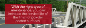 Powder coating is a very durable finish, but you can’t get away with treating it as though it doesn’t need any maintenance at all. Certain weather conditions can have a negative effect on the coating over time, for example.