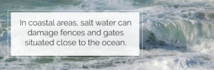 In coastal areas, saltwater can damage fences and gates situated close to the ocean. If they are not thoroughly cleaned at least once a year to remove the buildup, salt will remain attached to the coating and dull its appearance, leaving it looking chalky. To extend the life of your fence and gate, you’ll need to make sure you clean it properly.